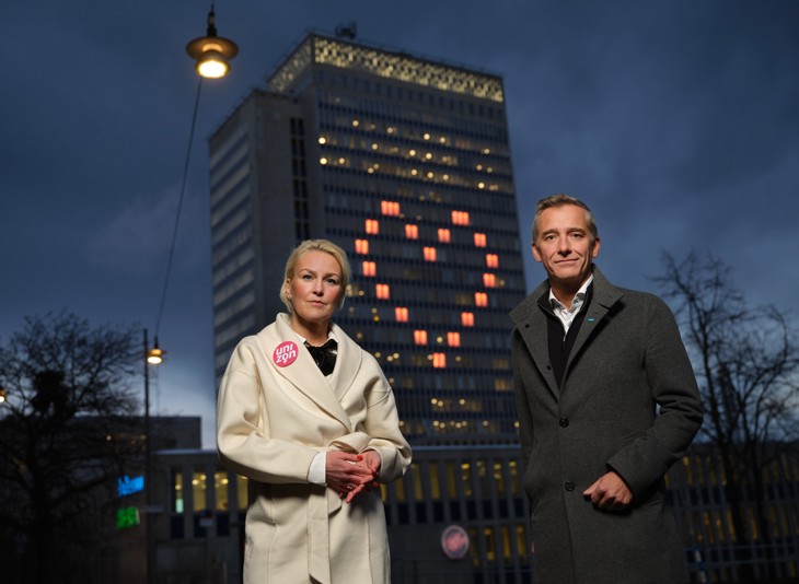 Unizon är ett riksförbund för 150 kvinnojourer, tjejjourer och ungdomsjourer och stöttar dagligen kvinnor och barn som utsatts för våld. Orange Day är dagen då FN uppmanar hela världen att uppmärksamma och manifestera mot våld mot kvinnor. Den 25 november tänder Olga Persson, ordförande Unizon och Jens Wikström, chef Affärsområde Sak, hjärtat som kommer att lysa orange från den 25 november. Den första advent kommer färgen på hjärtat att övergå till röd.