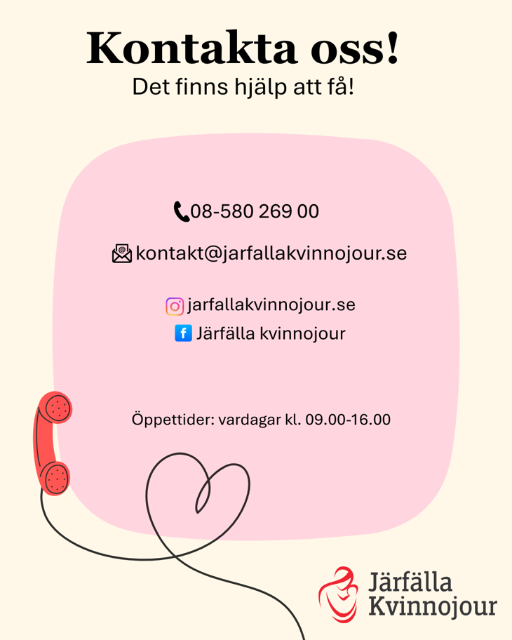 Känner du dig hotad, kränkt eller kontrollerad av din partner eller din familj? Behöver du prata med någon? Järfälla kvinnojour finns för dig som är, eller har varit, utsatt för hot och/eller våld i en nära relation. Alla som jobbar hos oss har tystnadsplikt och du kan vara anonym när du pratar med oss.