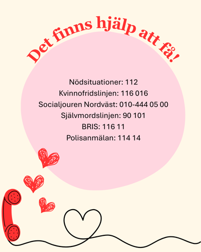 Om du behöver akut stöd kvällar och helger, om du är utsatt för våld, hot, missbruk, övergrepp eller om någon far illa. Socialjouren håller öppet årets alla dagar. För mer information klicka här eller ring på 010-444 05 00.