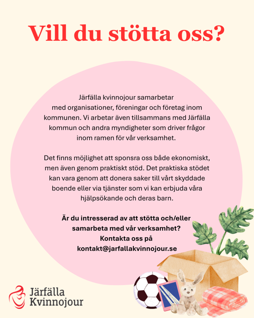 Är ditt företag intresserade av att stötta och/eller samarbeta med vår verksamhet – kontakta oss på kontakt@jarfallakvinnojour.se.